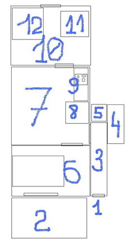 Долго думал, как бы описать так, чтобы было как можно более просто описать. Решил так, через схему. Собственно детальное описание будет рядом с каждой фотографей. Масштаб не везде соблюдён, потому смотрите на кадрах, как оно выглядит. В общем и целом так тут выглядят многие квартиры (по крайней мере из тех, что я смотрел). Вкратце, «стандартная» квартира «вытянута» поперёк дома, кухня в российском понимании отсутствует, вместо этого кухня как бы в одном помещении с гостиной; ещё одна особенность маленькие, антисоциального размера сортиры и практически полное отсутствие ванных, только душ. Причём нормального размера ванную комнату и клозет я видел только в одной квартире в западном Амстердаме (район известный, скажем так, своими обитателями); может исторически так сложилось, может по каким-то неочевидным причинам (отопление, система канализации, т.п. не знаю, пока не выяснил) |
