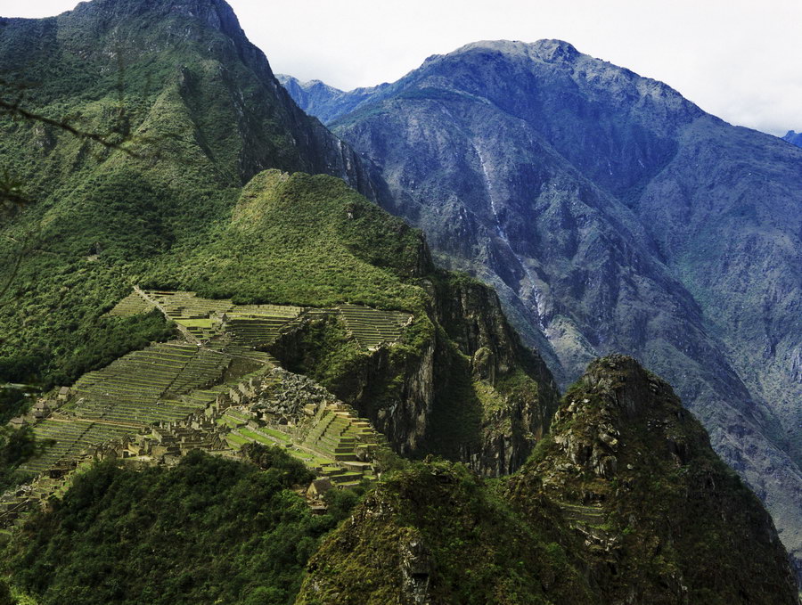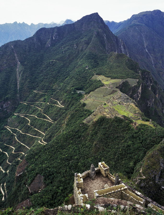 Ещё общий план, тут я расскажу подробнее, что есть что. Собственно кадр снять с где-то половины пути до храма Луны (инки добегали за 40 минут, мы дошли часа за два с половиной). Посередине справа затеряный город инков; вершина на ЗП собственно вершина горы Machu Picchu; прямая линия, проходящая прямо по склону горы «финишная прямая» дороги, приводившей в МП (мы по ней доходили до храма Солнца, причём в тот же день, что поднимались на Huayna Picchu, и я там практически отбросил коньки а всё из-за того, что инки построили (по крайней мере) этот отрезок пути для пешего воина, а не нагруженого фототехникой европеца, и расстояния между ступенями очень большие в результате «толкающая нога» не менялась и дичайше уставала, а смена ноги это сбой в ритме, короче, неудобно); рядом с затеряным городом виднеется крыша отеля (очень дорогое место, но желающим посмотреть рассвет или закат над МП это лучший вариант); зигзагообразная дорога дорога, по которой привозят турыстов (можно и подняться и спуститься самому, мы попробовали в первый день пинцет... вниз идти ноги устают похлеще, чем подниматься наверх!)