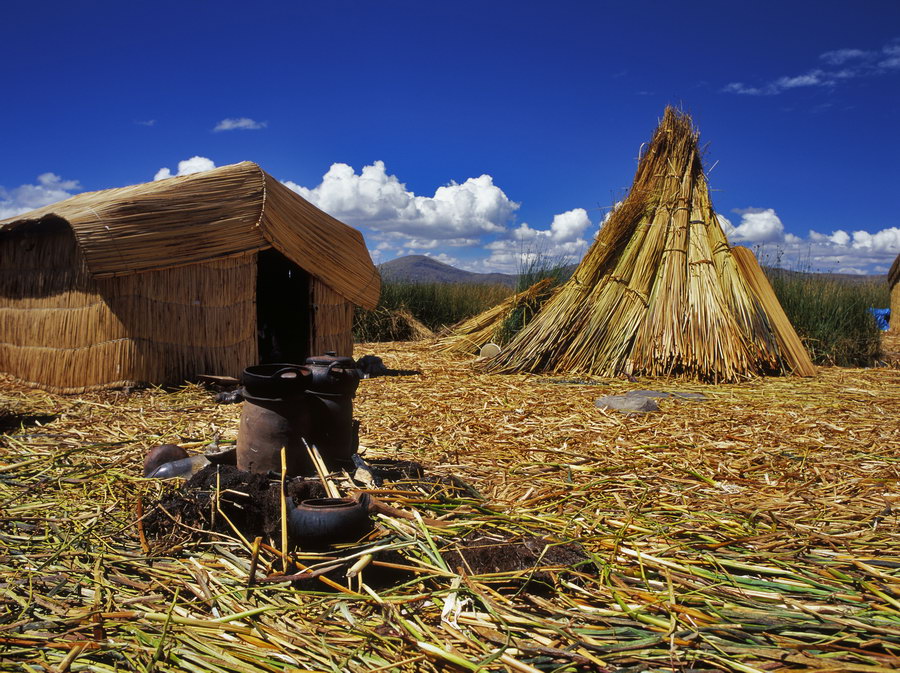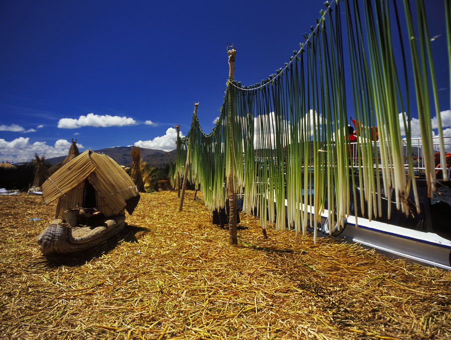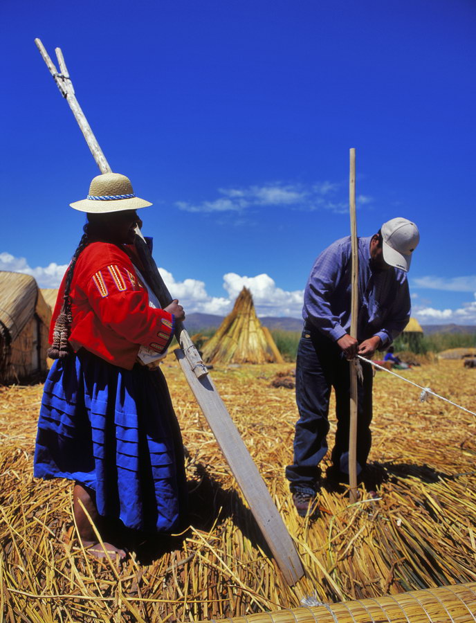 Остров строят так выбирается место подходящей глубины (порядка десяти метров), подбираются несколько кустов тростника, вынимаются из воды, корни усиливаются землёй и глиной и опускаются обратно на дно. Потом пространство между кустами заполняют тростником, слоем около полутра метров в толщину.