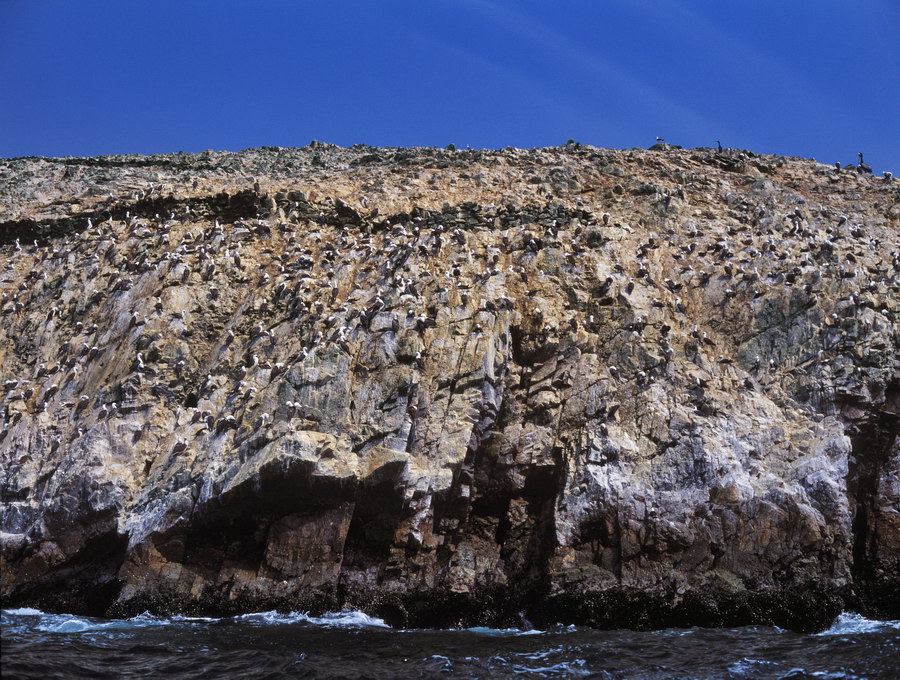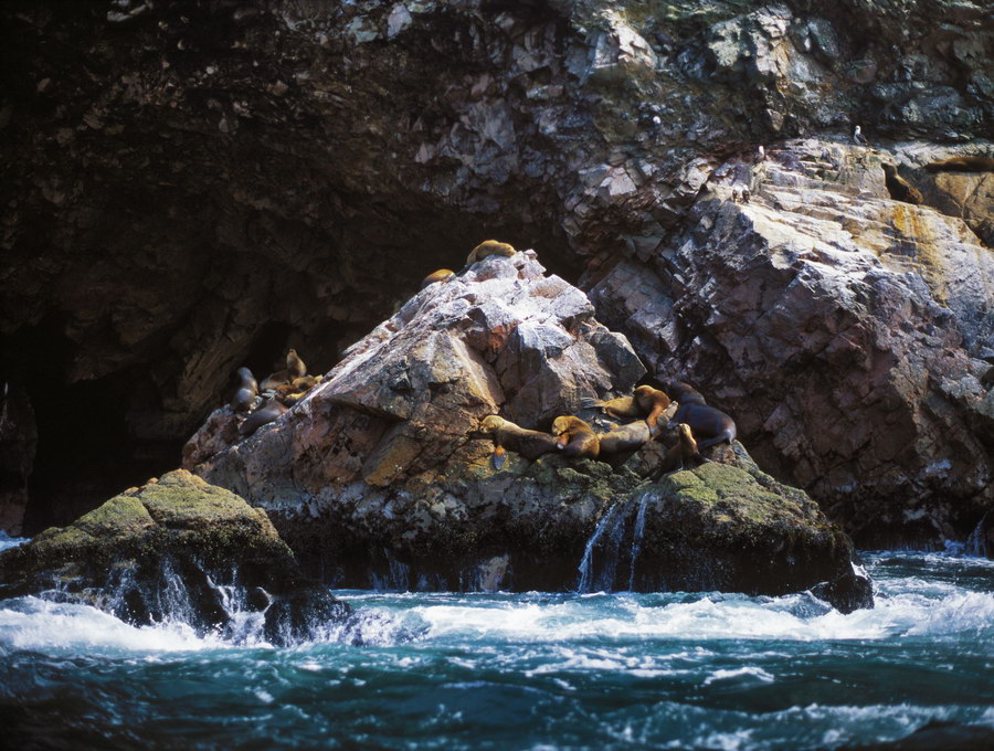 Там же находится заметная часть популяции тихоокеанских морских котиков. Естессвенных врагов у них в этой области нет, поэтому туда они приплывают, чтобы вырастить детёнышей. В кадре -- уголок «детского сада», в котором живут сотни детёнышей (к сожалению совсем маленьких не удалось заснять они были в тёмном гроте, и из шатающейся лодки кадр получился смазанным)