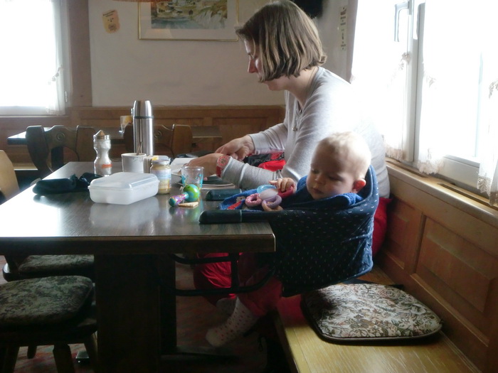 А тут в кадре (это мы зашли перекусить перед финальным съездом вниз) меня заинтересовал детский стульчик. Ну просто конструкция интересная. (Да,стул этот даден кафешкой вроде, а не часть санок, коляски, т.п.)