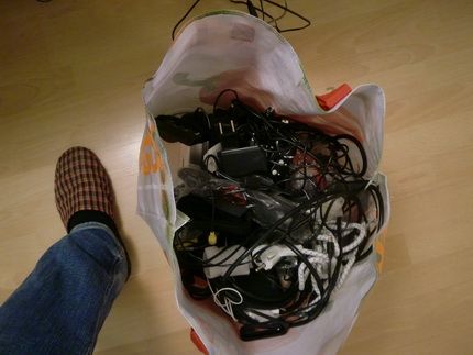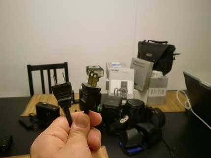 | С зарядкой, кстати,случился конфуз. Вилка-то американская! А камеру ух, как тянет проверить. | Но я же сын своего папы, и провода от всякого-разного не выбрасываю. Нашёлся в этом мешке нужный переходник. |