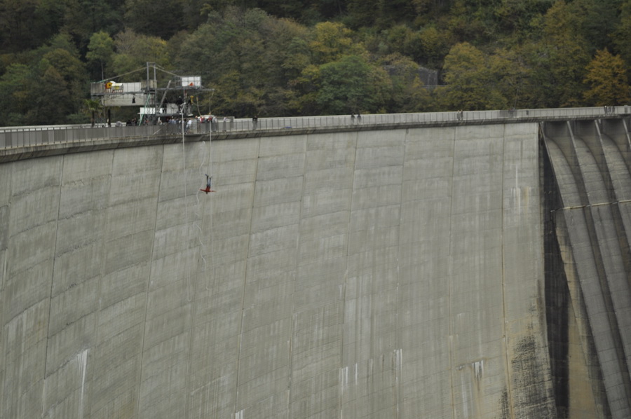 У дабмы необычный профиль обычно (как мне кажется) в вертикальном сечении в дабмы треугольник (трапеция, лучше сказать), а тут эллипс. Благодаря этому вершина нависает над ущельем и предпририимчивые люди организовали там bungee jump аттракцион: Небольшая точка в немного левее и ниже центра кадра человек.