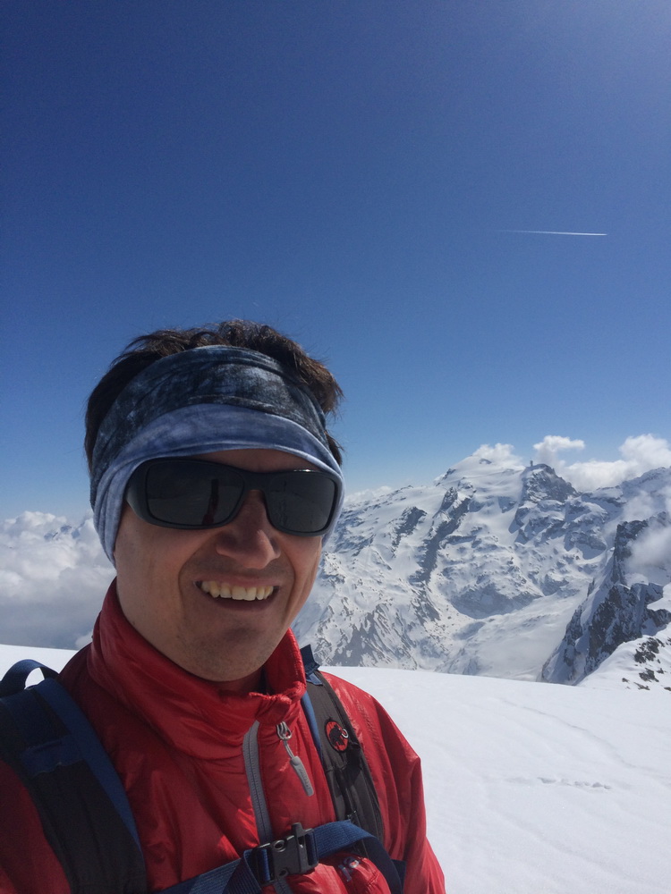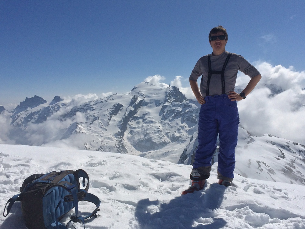 Селфи :), таки пришлось приодеться на вершине весьма холодный ветерок задул. И, букавльно после этого кадра, когда я надевал лыжи, выяснилось, что где-то по пути наверх, я сломал (погунл) крепления. Из-за этого тормозная скоба полность не встала и лыжа хоп-хоп-оп-пля-бл#, поехала сама вниз. Итить-колобродить! Без лыжы, в снегу... Благо, лыжа, хоть и уехала далеко, но поехала удачно туда, куда смог съехать экс-коллега так, что потом ему просто почти по пути было.