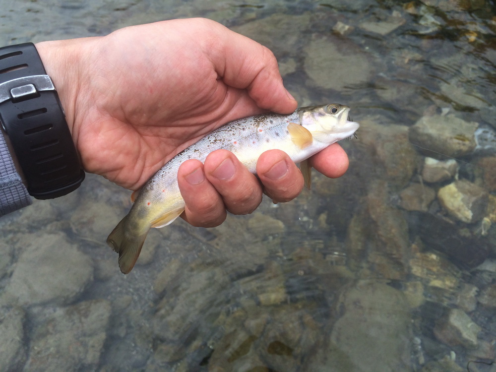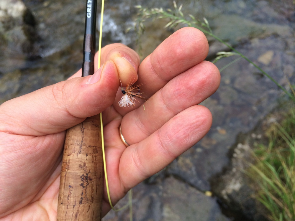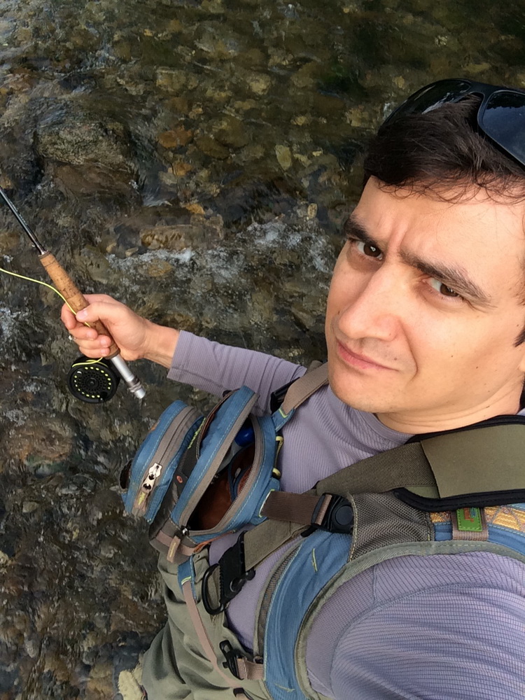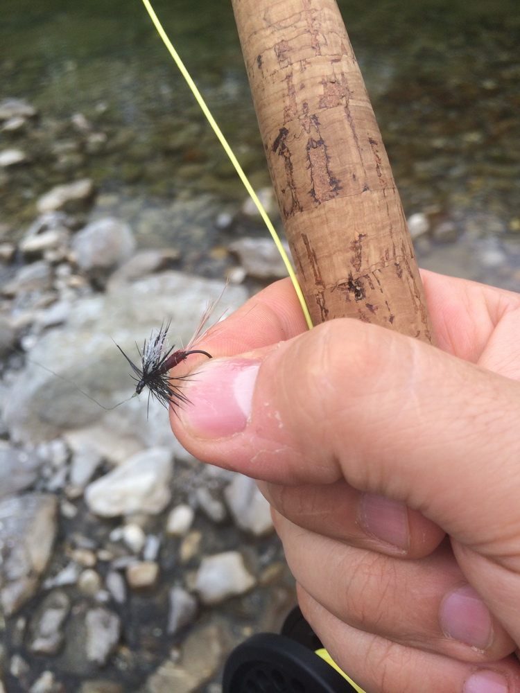 В начале участка. Сначала что-то не задалась рыбалка. Вроде форель видно, но сидят целыми косяками под камнями, на мух не реагируют. Это не горный ручей:
