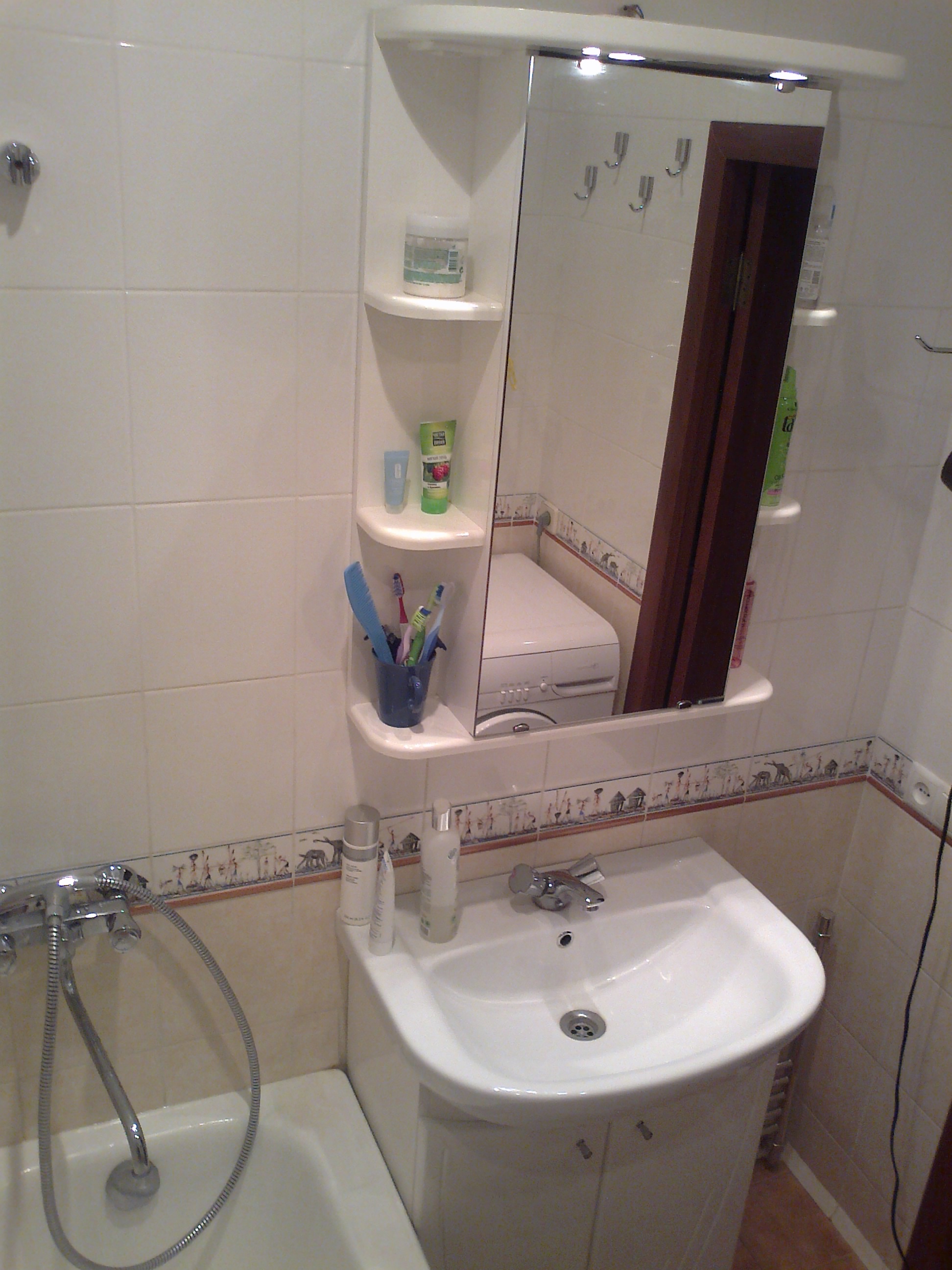 Раковина, шкафчик. За шкафом виден полотенцесушитель.