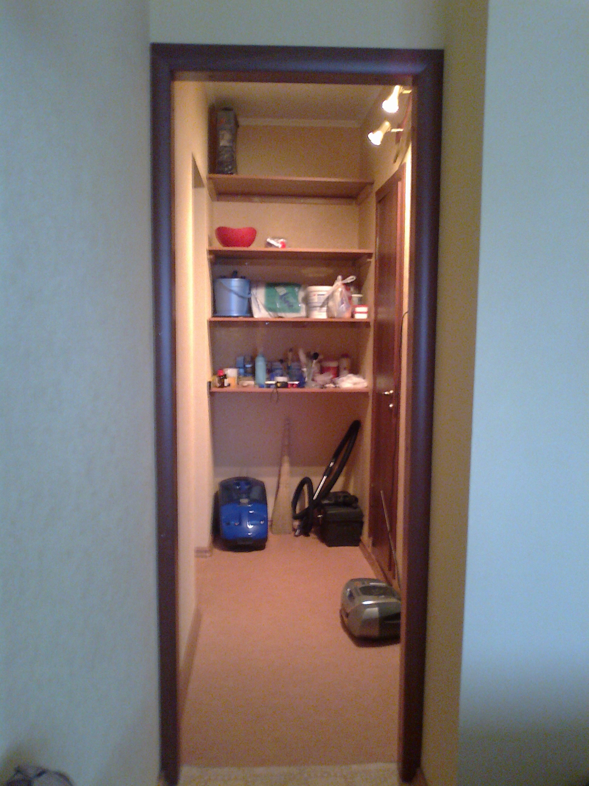 Из кухни в коридор. В торце коридора сделаны полки для хозяйственных мелочей.