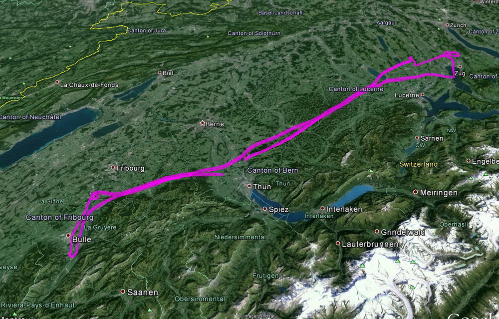 понял, что выше не получатеся (выше 10т фт начинается контролируемое пространство, а лететь оставаось немного), короче, сделал крюк. На треке видна эдакая загогулина (Сверху от надпись Canton of Friburg)