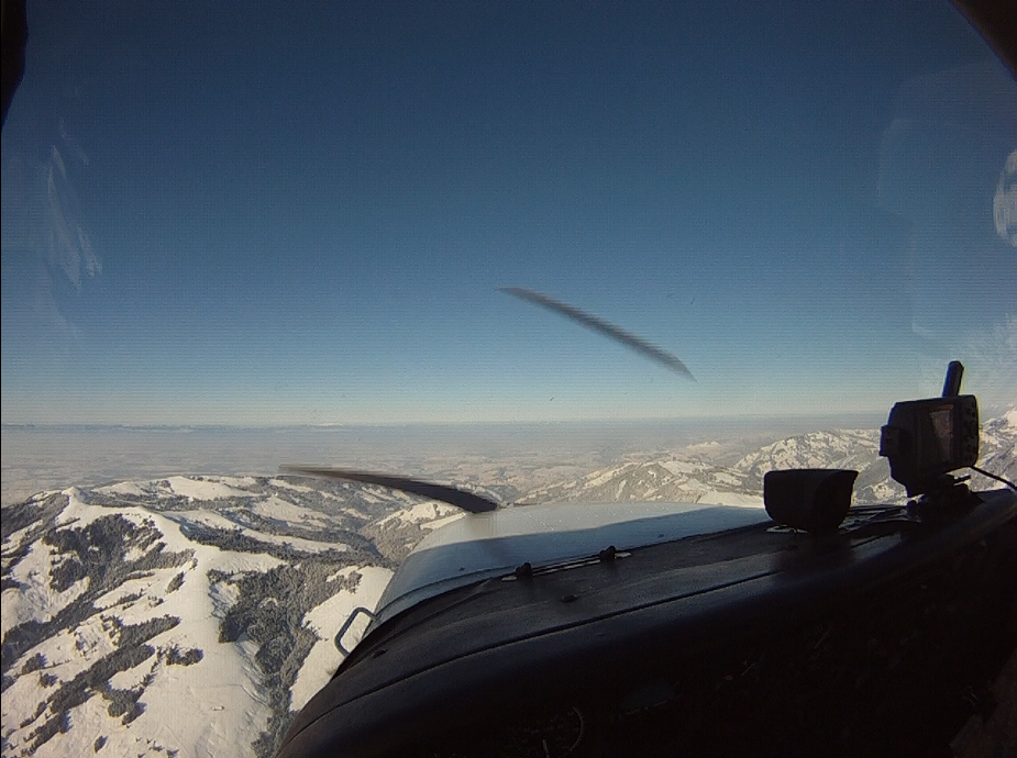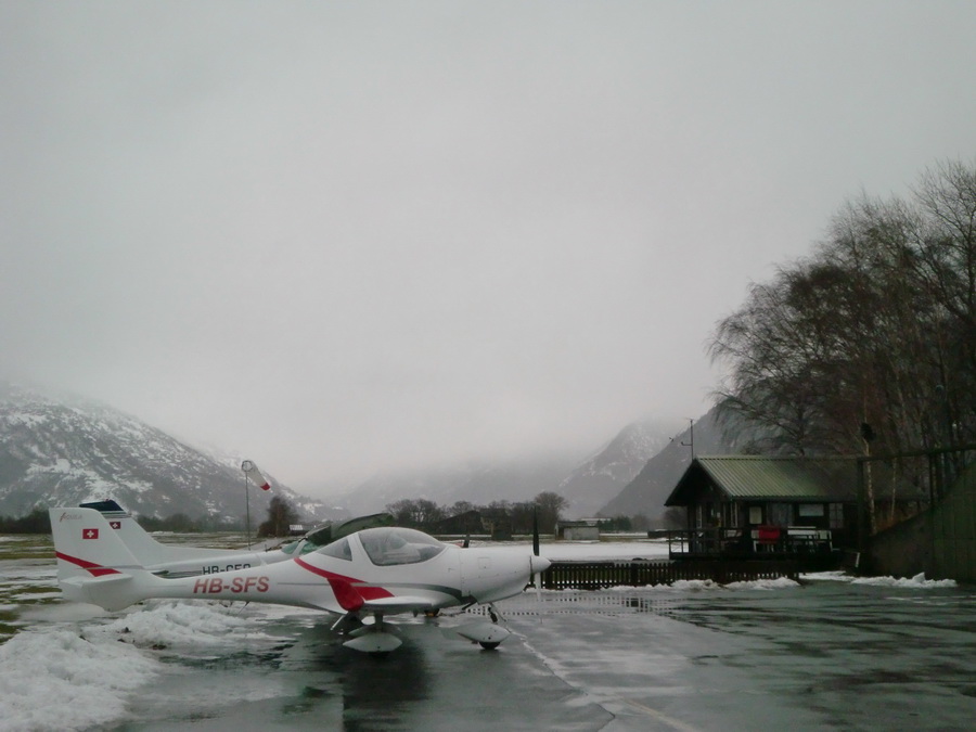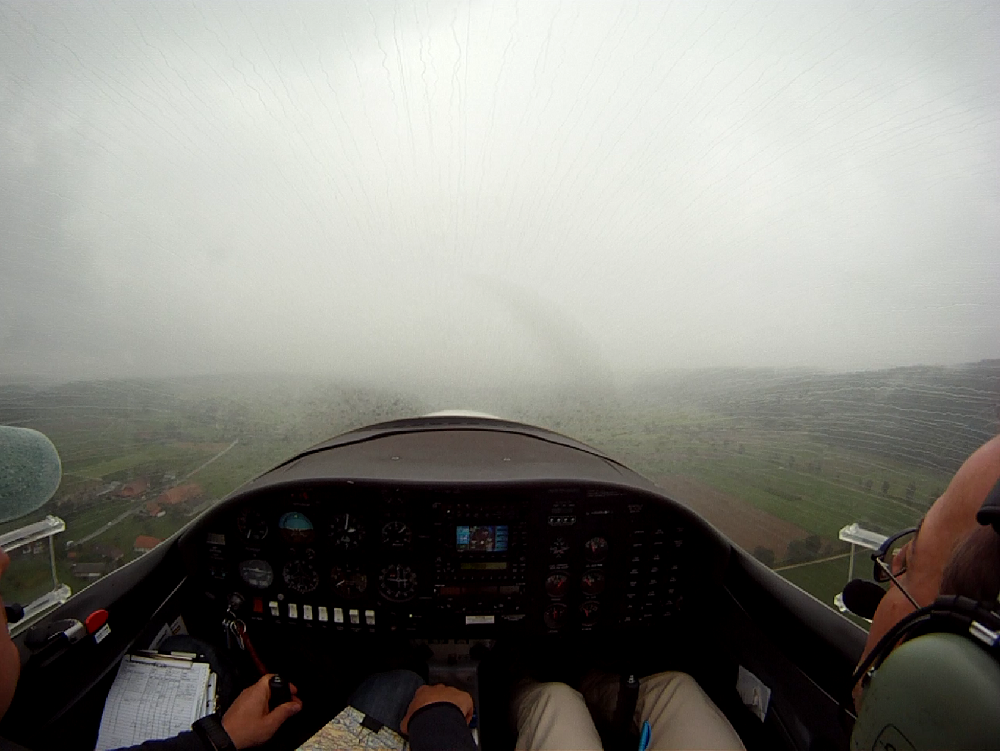 Занятие в субботу пропало. Беда прямо. Сейчас сезон погоды, которая называется Hochnebel ( http://de.wikipedia.org/wiki/Hochnebel_%28Schweiz%29 ) — Швейцария накрыта высоким давлением, каждый день стратус-облака с низкой базой, иногда так выглядит и вообще, как туман от земли и до куда-там. На самом деле в тот же полёт 22/09/2012 в Grenchen (LSGG) я уже запрашивал SVFR взлёт, ибо ceiling был 1100ft AGL. Выглядит это приблизительно так: