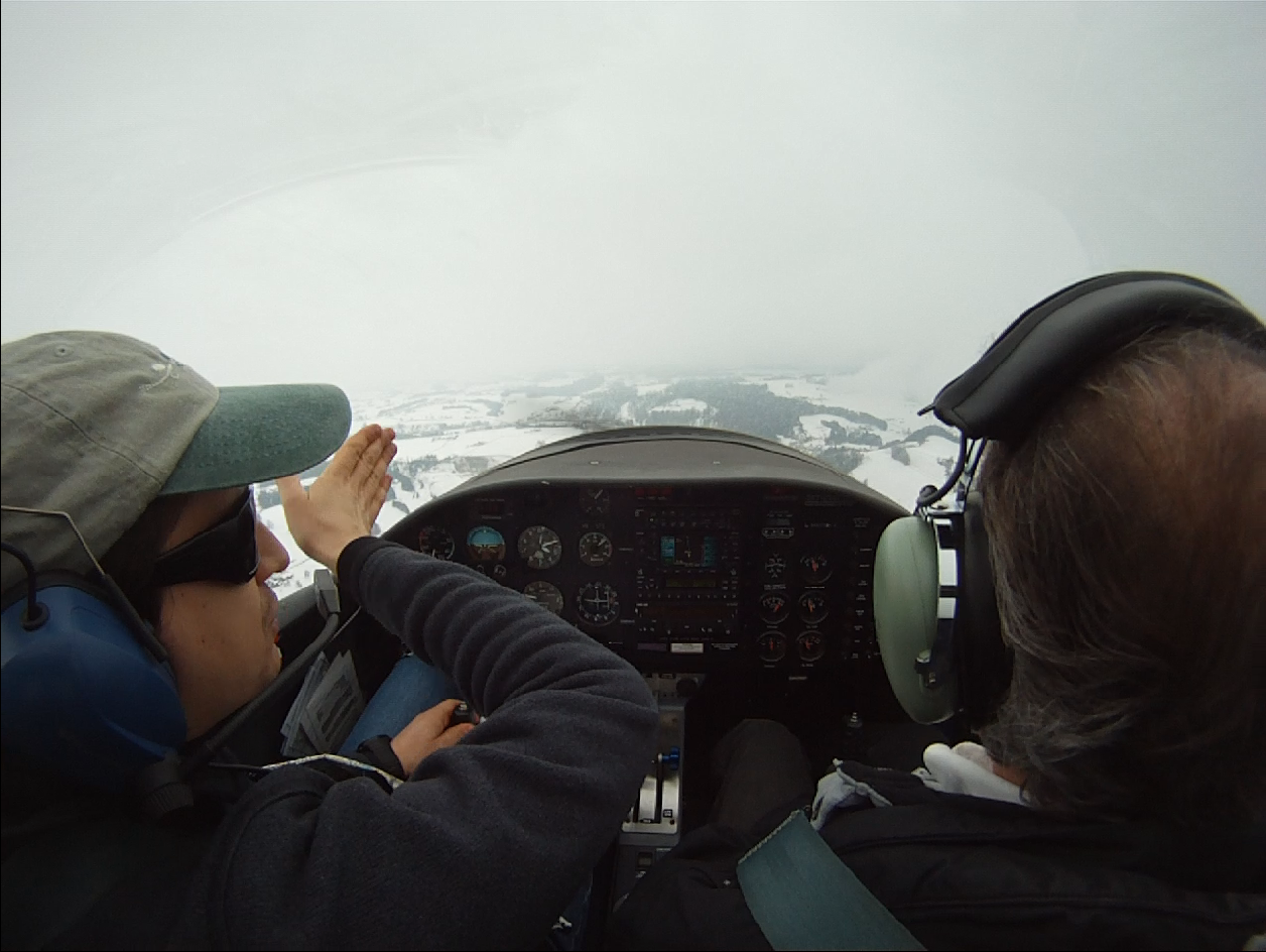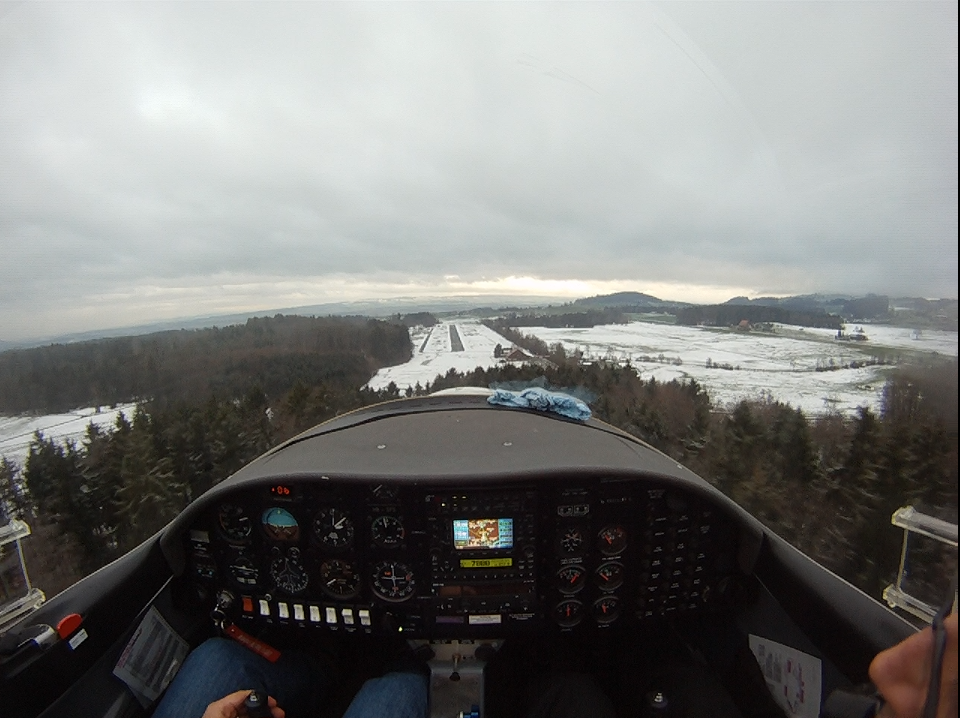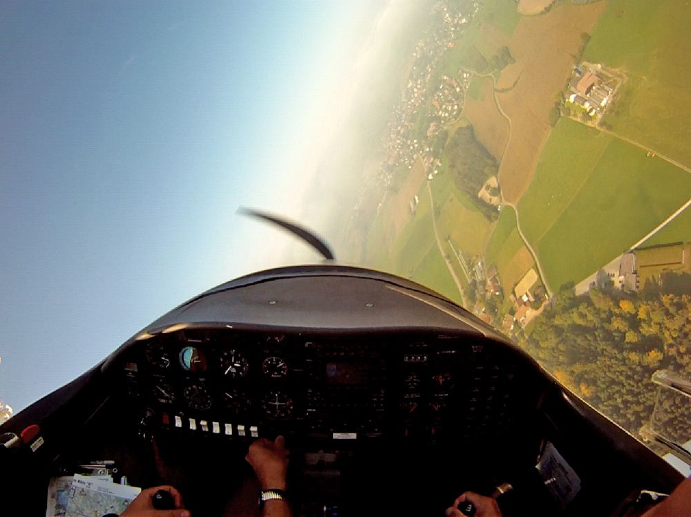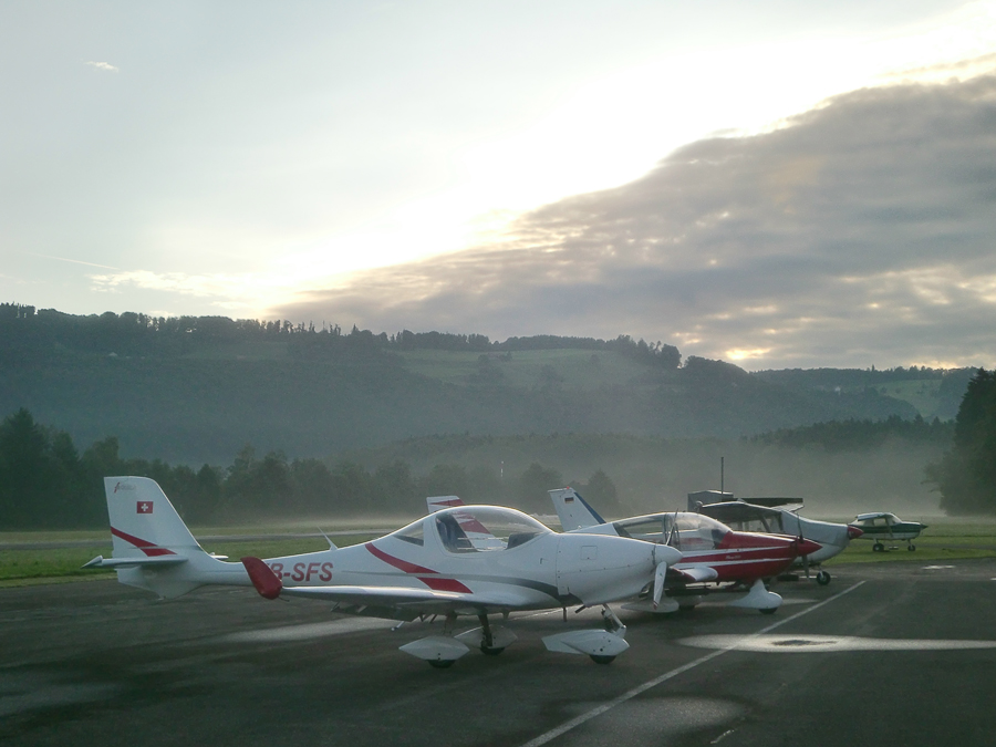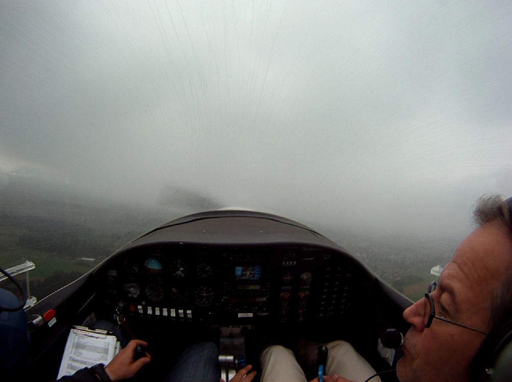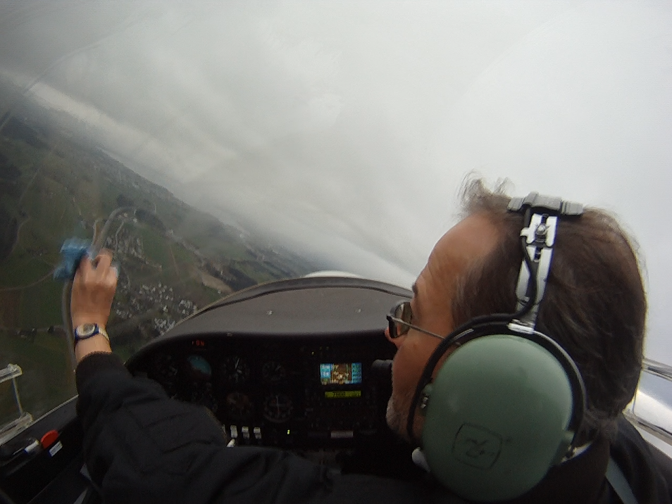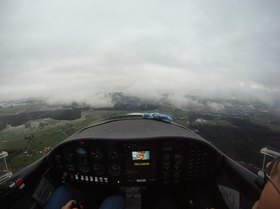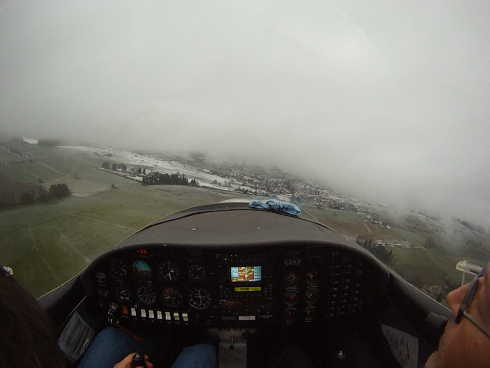 Занятие в субботу пропало. Беда прямо. Сейчас сезон погоды, которая называется Hochnebel ( http://de.wikipedia.org/wiki/Hochnebel_%28Schweiz%29 ) — Швейцария накрыта высоким давлением, каждый день стратус-облака с низкой базой, иногда так выглядит и вообще, как туман от земли и до куда-там. На самом деле в тот же полёт 22/09/2012 в Grenchen (LSGG) я уже запрашивал SVFR взлёт, ибо ceiling был 1100ft AGL. Выглядит это приблизительно так: