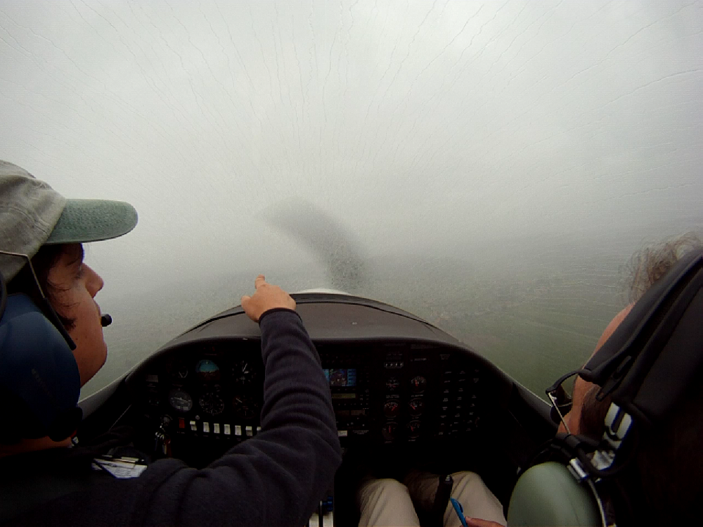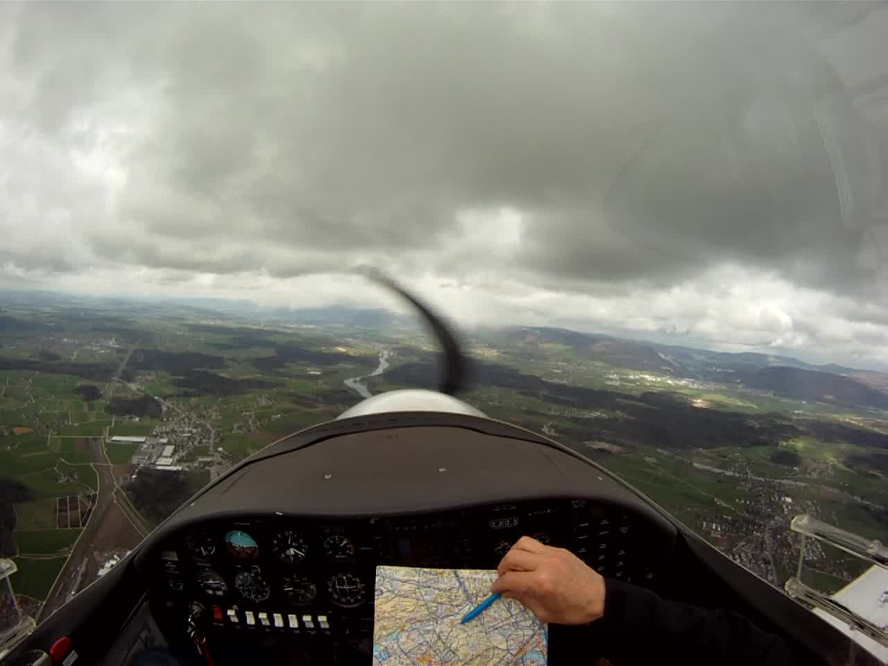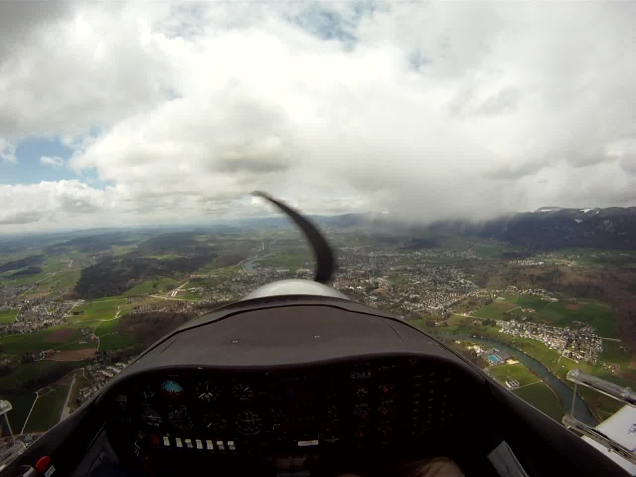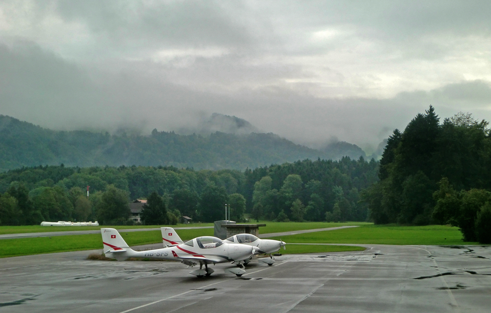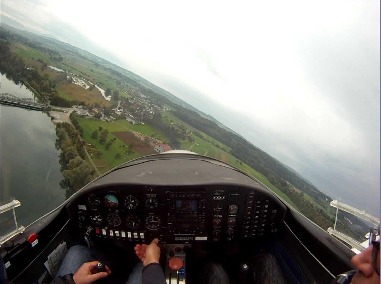 Занятие в субботу пропало. Беда прямо. Сейчас сезон погоды, которая называется Hochnebel ( http://de.wikipedia.org/wiki/Hochnebel_%28Schweiz%29 ) — Швейцария накрыта высоким давлением, каждый день стратус-облака с низкой базой, иногда так выглядит и вообще, как туман от земли и до куда-там. На самом деле в тот же полёт 22/09/2012 в Grenchen (LSGG) я уже запрашивал SVFR взлёт, ибо ceiling был 1100ft AGL. Выглядит это приблизительно так: