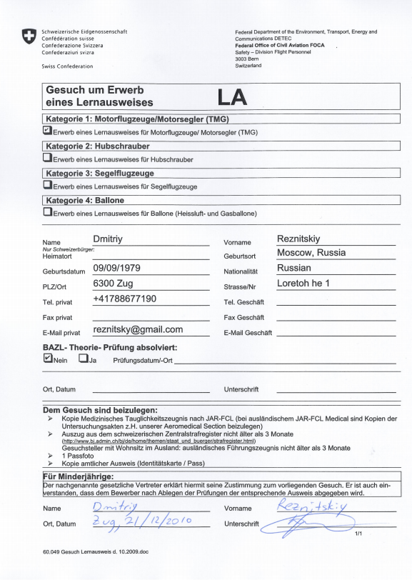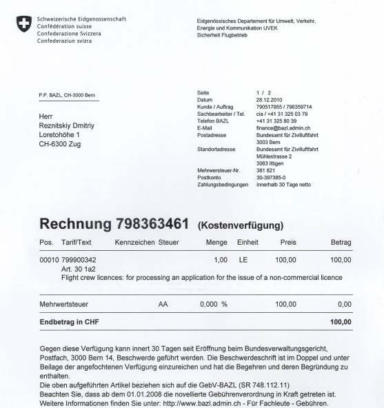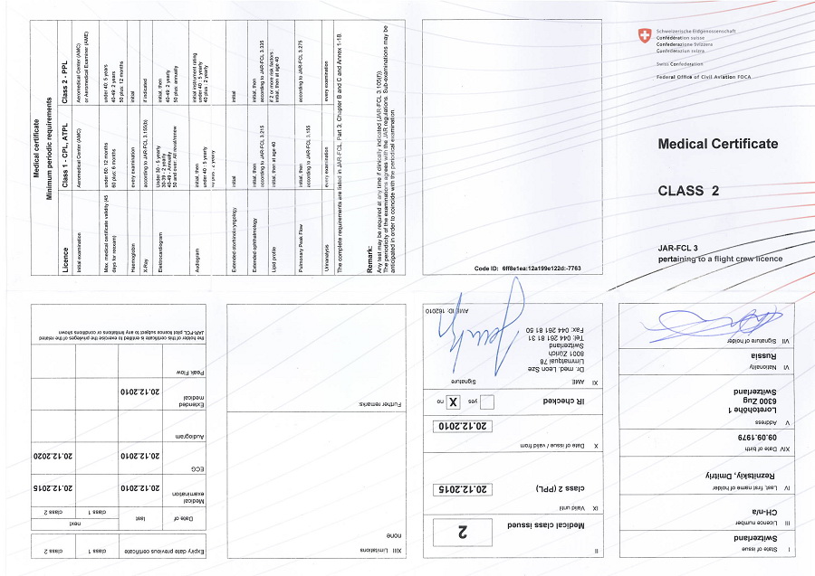 Результат осмотра (помимо справки, которая выше, и счёта от доктора) — регистрация в FOCA (Federal Office of Civil Aviation) http://www.bazl.admin.ch/index.html?lang=en (сайт, заметим, дублирован для удобства понаехавших, на английский язык, как и многие из местных административных порталов). Эта регистрация — всё, теперь все мои передвижения по авиа пути будут регистрироваться там.