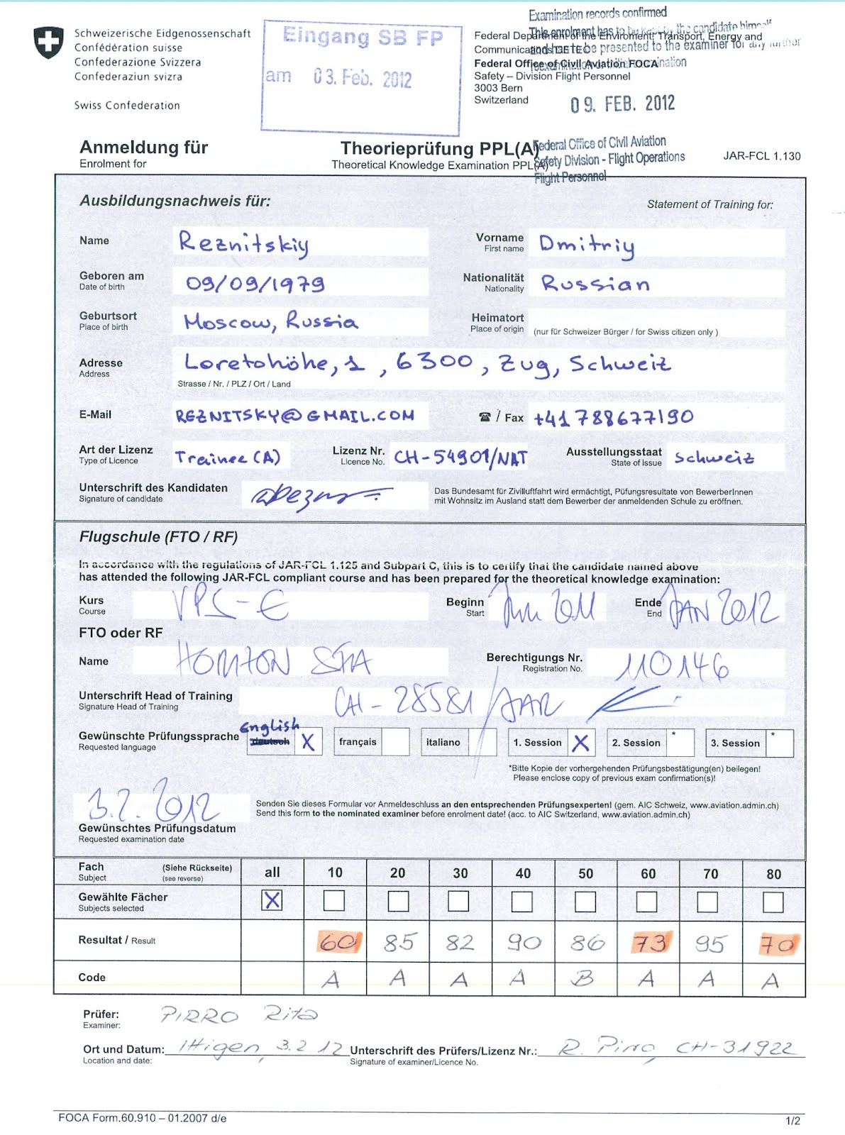 Теоретический экзамен сдал 08/09/2012, однако ж бумагу об успешной сдаче до сих пор не получил. До сих пор бумаги с экзаменов (обе попытки RTF, обе попытки теории) получал буквально через несколько дней. Написал напрямую экзаменатору — Rita Pirro (Inspector Theoretical Knowledge and Examinations), получил ответ буквально через двадцать минут (соответствующий отдел завален работой, сегодня-завтра должны выслать). Заодно пожелала удачи в экзамене по практике. Приятно! Опять же — приятно, что вот так запросто можно написать чиновнику и моментально получить ответ.