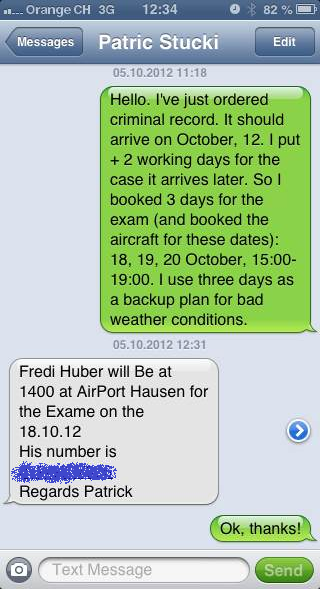 Criminal record протух (валиден три месяца для PPL), я забыл пароль от своего SuisseId ( http://www.suisseid.ch/ ), в результате ждать мне новый criminal record до 12 числа. Тут ещё мини-почти-отпуск. В результате забучил три даты: 18, 19 и 20 октября.