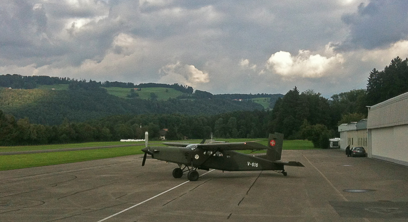 Кстати, перед полётом. При подъезде к аэропорту, увидел несколько человек с ружьями. Сначала подумал было, что охотники (там олени водятся). Потом смотрю — не, не охотники — возраст не тот, мальчики совсем, да и в руках не охотничьи ружья, а Sturmgewehr 90 ( http://en.wikipedia.org/wiki/Sturmgewehr_90 ). Вцелом, тут нормально увидеть такое. Ну остановились, может зов природы, а тут лесок рядом. Свернул к аэродрому, там ещё парочка таких тусуется. Я своими делами занимаюсь, слышу по радио непонятный позывной, идёт на посадку. Сел вот такой Pilatus PC-6 ( http://en.wikipedia.org/wiki/Pilatus_PC-6 ):