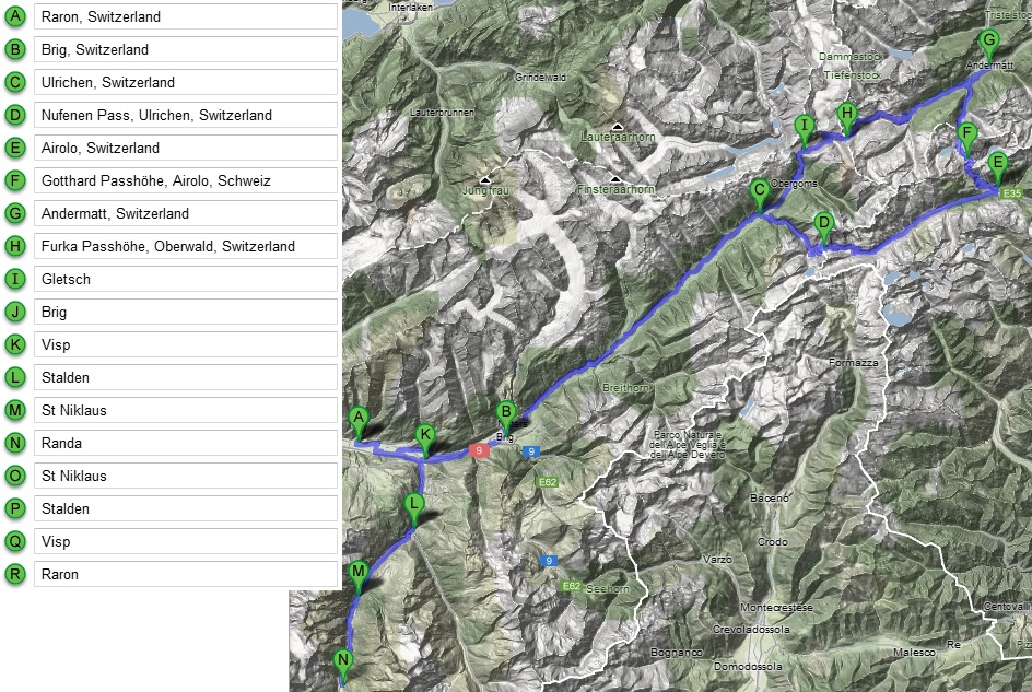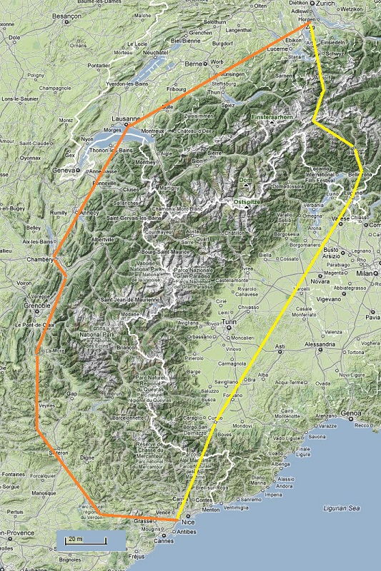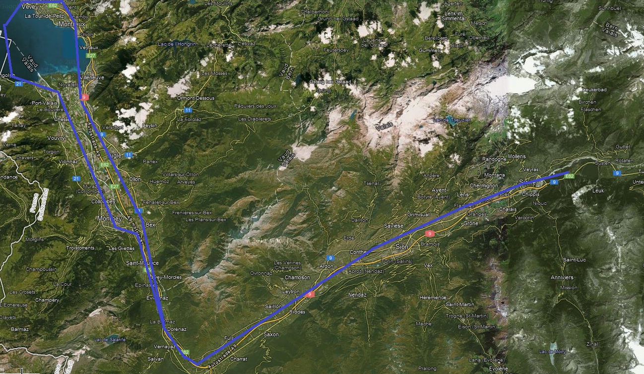 Предзакатное время.. Полетели? Полетели. Сначала предполётный чеклист вне самолёта, открываем двери, и Ролан говорит: садись в левое кресло. В левое? Я? Вот так сразу? (Примечание для тех, кто вне этого дела: левая “чашка” — командир воздушного судна, по крайней мере в коммерческой авиации). Главный говорит так, стало быть так. Внутресамолётный чеклист, дальше завёл и всё, говорит: рули до взлёта. Эх-ма, я ж и машину-то в жизни водил всего пару раз по пять минут. Схема управления (штурвал+педали) даже проще, чем в машине, так что довёз. Взлёт, естественно делал не я. вздёт, набор высоты, и опять — бери штурвал, лети. “Давай на ту точку”, “давай нос на ту вершину”, “знаешь, где твой дом, давай над ним”. В итоге мы пролетели приблизительно вот по такому маршруту: