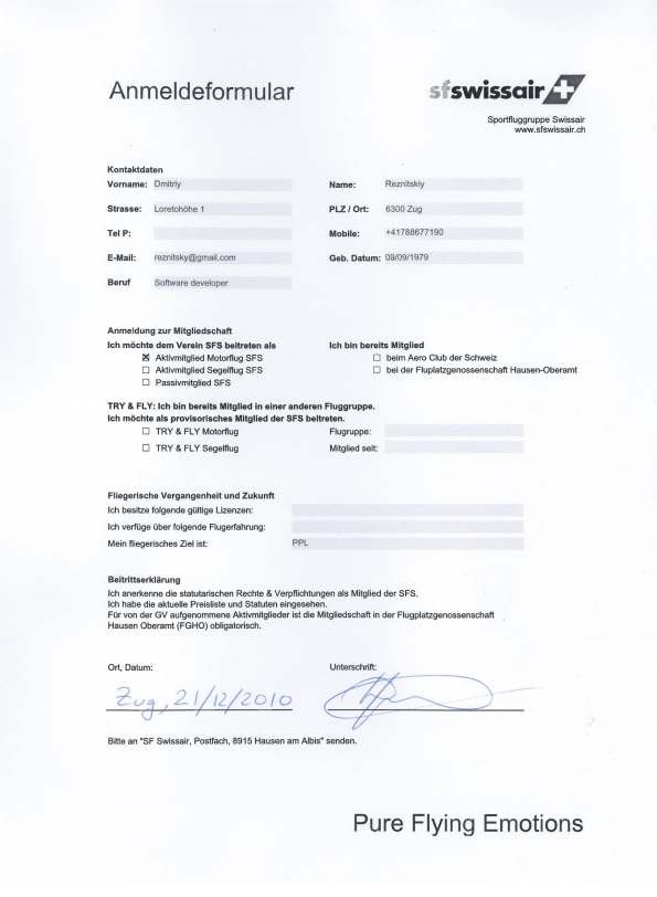 Почему лётное удостоверение? Летать, очевидно же. Почему именно летать? Не знаю, что на это ответить. Как описать вкус сахара или воллюст на словах человеку, который с этим не знаком? Вот такие же чувства и полётам. Наверняка многим снятся полёты (говорят, дескать, человек в это время растёт). Мне так до сих пор иногда бывает привидится такое в ночи: обычно как-будто я иду или бегу, шаги становятся шире, шире и в какой-то момент отрываюсь от земли и уже “бегу” по воздуху. Так что чувства не передать. Почему я решился сейчас? Так вот жизнь так сложилась. Как переехал в Швейцарию ( http://rezdm.livejournal.com/146880.html ), “попёрло”. Как-то жизнь начала наполняться тем, чем я хотел бы заниматься. почувствовал, что вот можно и развернуться. И полёты — это одно из занятий, о котором я думал. Да, наверное стоит уточнить сразу, что я не знаток авиации, я не любитель споттиннга. В полётах меня привлекает совершенно другое. Можете сравнить это с фотографией. Кого волнует, чем снимал Адамс или Брессон? Смысл тот же.
