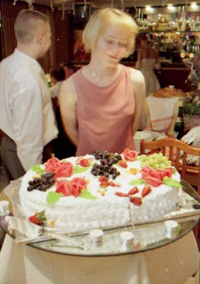 Nu i brak "xudozhestvennyj". Skol'ko raz ya sam sebe i znakomym tverdil. "CHelovek v rost - prover' nogi, ruki, golovu (chtoby ne obrezalos'), chtoby ne torchali iz-za golovy byaki vsyakie (xotya ya v ZAGSe narochno prilepil zhenixu svetyaschiesya "rozhki"), chtoby so storon ne bylo obrezannyx ruk, golov, t.p. Lyudej, ne voshedshix v kadr". Vot. Vse oshibki, vse vozmozhnye ix sochetaniya ya sovershil. Kompozicii v kadrax - voobsche nikakoj. Kuda ya smotrel?! Tipichnyj primer - portret. YA obychno fokusiruyus' central'nym datchikom po licu, potom kadriruyu tak, chtoby nad golovoj ne ostalos' pustoe mesto i snimayu. Zdes' zhe neeeeet. "Kak gvozd' v dosku" Lico v samoj seredine kadra. Kuda ya smotrel?!!! Nu ladno v obychnoj zhizni, snimki, kotorye ya delayu dlya sebya, no yyto zh raz v zhizni (nadeyus').