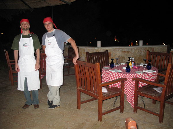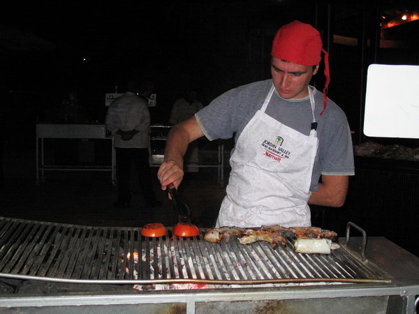 На Мертвом море жили в гостинице MARRIOTT. Хорошая, конечно, гостиница. Только одно плохо - находится в пустынном месте, далеко отовсюду, до ближайшего города - 15 км. Так что, деваться отдыхающим некуда - ужинать приходится в ресторанах отеля. А они, разумеется, этим пользуются, и цены указывают "ничего себе". Ужинали в одном из таких ресторанов, но с "самообслуживаним" - получаешь наряд повара, выбираешь сырые продукты и жаришь их на открытом огне как захочешь. Рядом, правда, стоят повара, готовые помочь если что, или вообще все сделать, если гостю лень возиться.